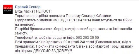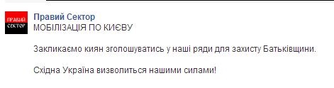 «Призываем киевлян вступать в наши ряды для защиты Родины. Восточная Украина освободится нашими силами! Только не задавайте глупых вопросов. Готовьте вещи для выезда и силу духа» - говорится в сообщениях Правого сектора.