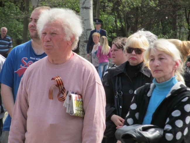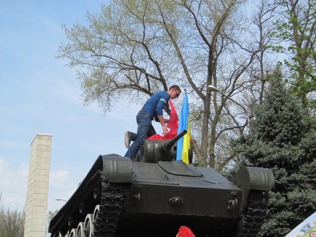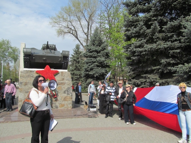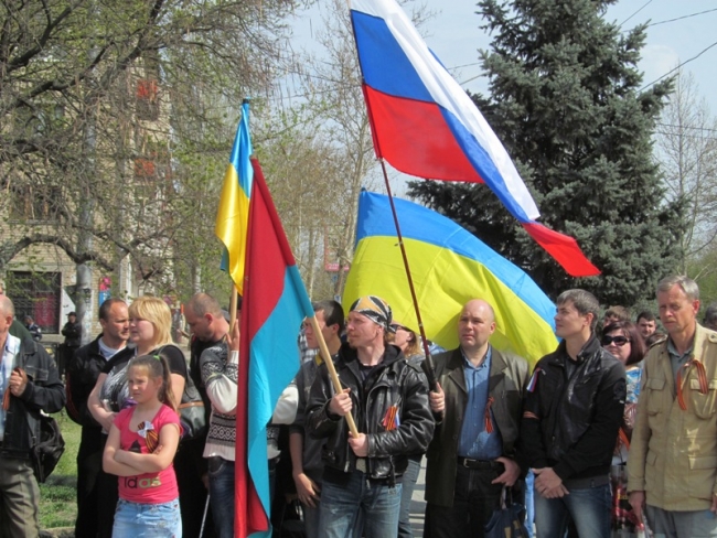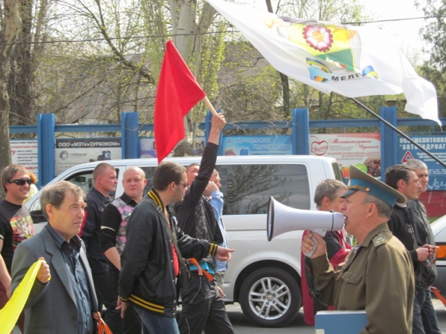 19 апреля в городе прошел субботний митинг пророссийски настроенных горожан. Колонна с уже знакомым флагом "три в одном" (Украина, Россия, Белоруссия) прошла от пл. Победы до мемориала Братское кладбище.