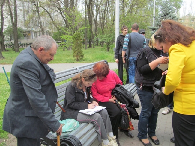 На мероприятии шел сбор средств в "фонд антимайдан". Как рассказал Валентин Смирнов, они нужны на бензин и для распечатки агитационных материалов. Выступающие заявили также, что в городе вот-вот зарегистрируют "Русский блок" как политическую организацию. Возглавит ее Екатерина Уманец. Списки желающих вступить в партию формировались тут же, на скамейке.