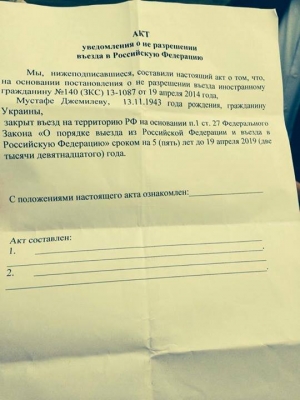"Мы, нижеподписавшиеся, составили настоящий акт о том, что, на основании постановления о неразрешении въезда иностранному гражданину №140 (ЗКС) 13-1087 от 19 апреля 2014 года, Мустафе Джемилеву 13.11.1943 года рождения, гражданину Украины, закрыт въезд на территорию РФ на основании п.1. ст. 27 Федерального закона "О порядке выезда из Российской Федерации и въезда в Российскую Федерацию" сроком на 5 (пять) лет до 19 апреля 2019 года", - говорится в указанном акте", - заявила Муслимова