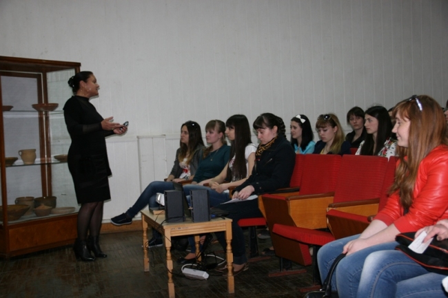 Как рассказала научный сотрудник музея Т. Шевченко-Чепелева, в фондах музея хранится много интересных глиняных изделий, собрав которые воедино и объединив увлекательные сведения о них в единый рассказ, и получилась "Гончарная история". На территории современной Украины человек открыл керамику в эпоху неолита - VI-IV тысячелетия до н.э., когда он еще ходил в звериных шкурах и жил в пещере. Из комочка глины сначала появились довольно грубые сосуды, а со временем это ремесло было доведено до совершенства. Т. Шевченко-Чепелева показала гнездо синички, возможно, глядя на которое древний человек и передал его форму в сосуде из глины. Она также обратила внимание студентов на то, что древние сосуды имели конусовидное дно. Почему? Оказывается, тогда человек еще не знал, что такое стол, поэтому делал углубление в земле и ставил в него посудину.