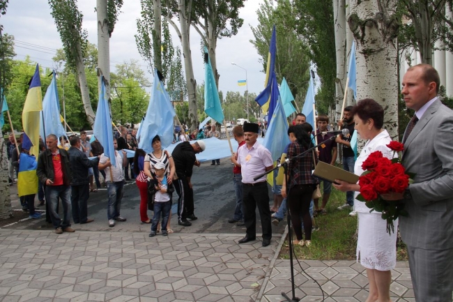 Автопробег закончился у памятника жертвам голодомора и политических репрессий. Здесь участники митинга вспомнили всех, кто погиб из-за политической воли руководства СССР. После этого колонна участников митинга с двумя огромными полотнищами - национальным флагом Украины и крымско-татарским флагом, а также десятками флагов обычного размера прошла на площадь Победы, где состоялся траурный митинг.