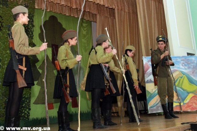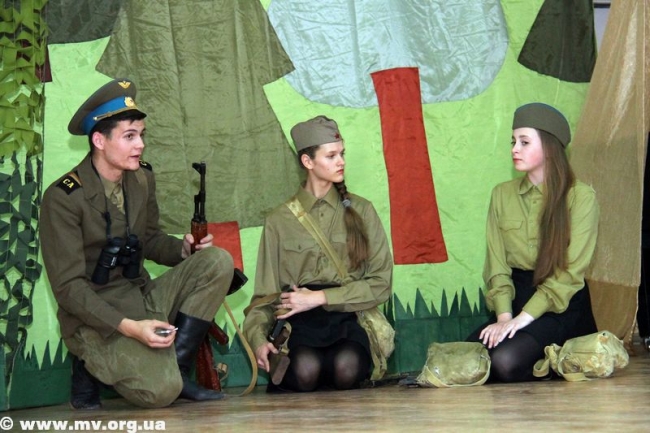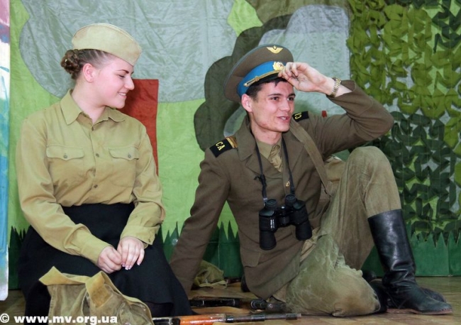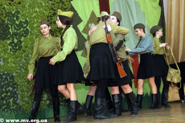 По словам заведующей театральным отделением ДШИ Елены Соболевой, поставить спектакль "А зори здесь тихие" по одноименной повести Бориса Васильева она предложила своему творческому коллективу еще год назад. Но, как отметила режиссер-постановщик спектакля Татьяна Терехина, нужно было основательно подготовиться, настроиться на такое серьезное произведение. "Меня сдерживало еще и то, что реквизит нужно было искать, потому что вещи, иллюстрирующие период Великой Отечественной войны, очень тяжело найти. Дети сносили к нам фляги, сумки. Гимнастерки взяли в костюмерной, но пришлось еще дошивать - сейчас даже ткани похожей нет, - рассказывает Т. Терехина. - Еще одна сложность - та война далеко от нас. Смогут ли современные ребята, которым от 14 до 20 лет, понять, почувствовать то, чем жили в мае 1942 года? Как артисты сыграют страх перед войной? Воспримет ли зритель? Ведь современникам тяжело войти в те обстоятельства".