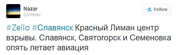 "Красный Лиман центр взрывы. Славянск, Святогорск и Семеновка опять летает авиация" - сообщает пользователь Nazar @Viterec.