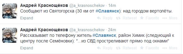 "Сообщают из Святогорска (30 км от Славянска): над городом вертолеты". "…район Химик (следующий к центру после Семеновки): "...из СВД простреливают прямо под окнами"".