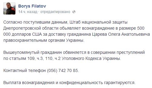 Согласно поступившим данным, Штаб национальной защиты Днепропетровской области объявляет вознаграждение в размере 500 тысяч долларов США за доставку гражданина Царева Олега Анатольевича правоохранительным органам Украины. Об этом написал на своей странице в Facebook заместитель губернатора Днепропетровской области Борис Филатов.