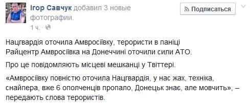 "Амвросиевку полностью окружила Нацгвардия, у нас ужас, техника, снайперы, уже 6 ополченцев пропало, Донецк знает, но молчит", - говорится в сообщении.