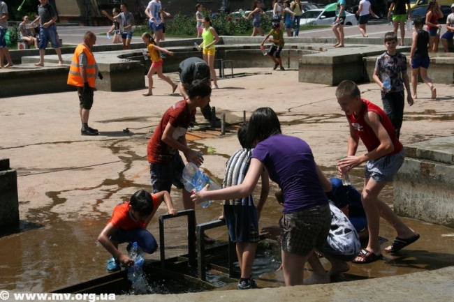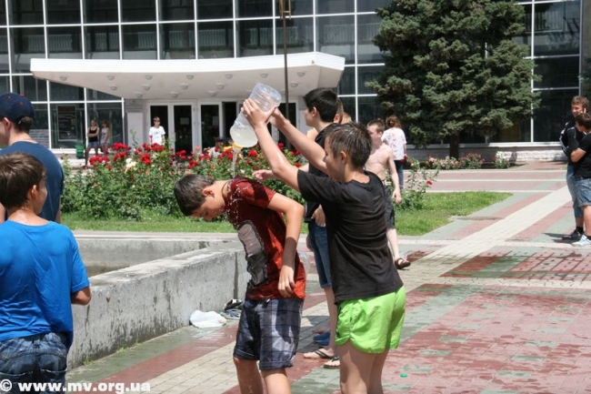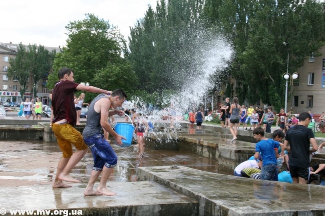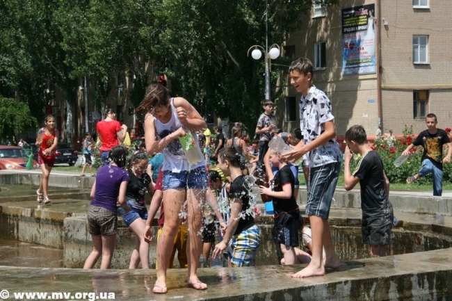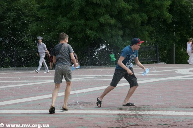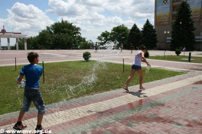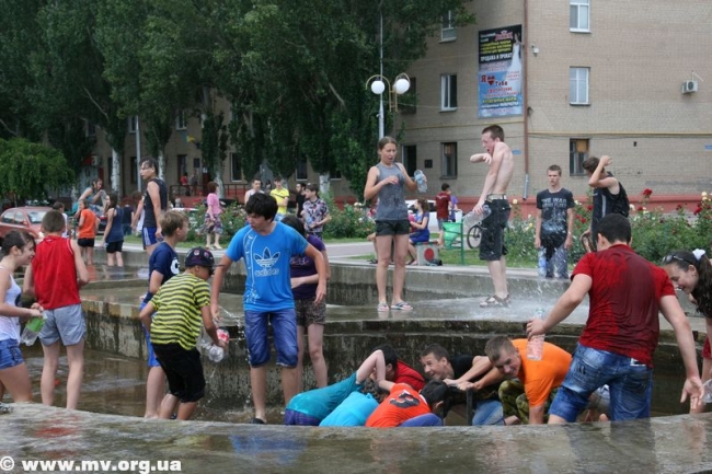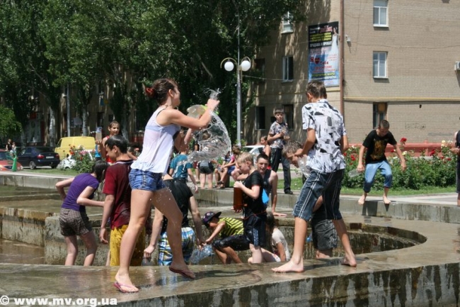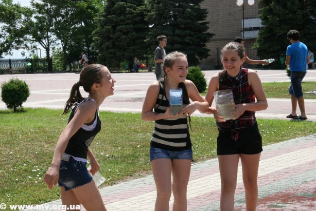 Устав ждать, пока специалисты окончат начатое дело, молодежь ринулась наполнять свои баклаги водой из отстойников – зеленоватой и с отчетливым запахом тины. Но никого это не смущало, ведь настрой на битву был, и цель оправдывала средства. Поначалу коммунальщики пытались образумить детей, призывали оставить глупую затею, но естественно, услышаны не были. Спустя час специалисты закончили свое дело, собрались и уехали. И детвора воодушевилась, мол, сейчас пойдет вода. Но не тут-то было. Самые смелые решили обследовать место, откуда должна бы бить центральная струя и поняли, что ее просто заварили металлом и воды не будет. (Фонтан действительно законсервировали на время его покраски – авт.) В итоге стройной колонной несколько десятков ребят двинулись с площади к горисполкому, скандируя «Водный бум» и стуча пустыми пластиковыми бутылками. Таким маршем детвора спустилась по ступеням, свернула на ул. К. Маркса, далее обогнула центральный рынок, вышла к горотделу милиции и снова поднялась на площадь. Зайти в здание горисполкома или к правоохранителям дети так и не решились и отправились к реке Молочной, где от души порезвились. Как только фонтан починят, школьники обещают устроить новый "Водный бум".