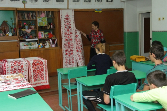 Заслуженный мастер народного творчества Украины, известная на всю страну и за ее пределами вышивальщица Надежда Денисюк дала урок студентам мелитопольского ВПУ. На практическое занятие по декоративно-прикладному искусству Надежда Михайловна принесла свои рушники, чтобы рассказать детям о традициях украинской вышивки.