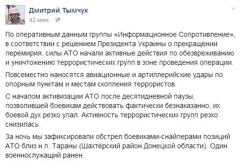 Глава группы "Информационное сопротивление" Дмитрий Тымчук в своем Facebook сообщил о том, что силы АТО начали активные действия по обезвреживанию и уничтожению групп сепаратистов в зоне проведения операции.