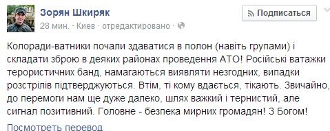 "Колорады начали сдаваться в плен (даже группами) и складывать оружие в некоторых районах проведения АТО! Лидеры террористов пытаются выявлять несогласных, случаи расстрелов подтверждаются", - написал советник главы МВД.