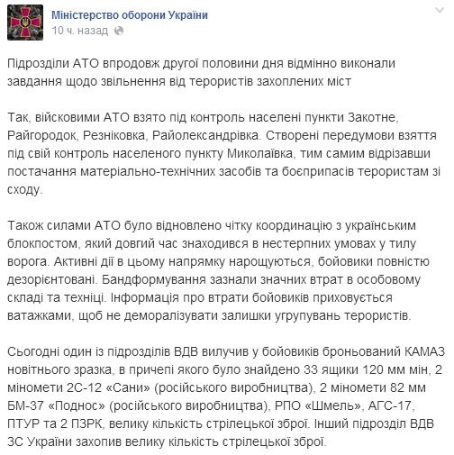 Пресс-служба ведомства на странице в Facebook подтвердила неофициальную информацию о том, что бойцы АТО взяли под контроль населенные пункты Райгородок, Резниковка и Рай-Александровка неподалеку от Славянска и отрезали город от поставок боеприпасов с востока.