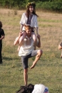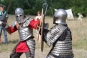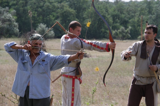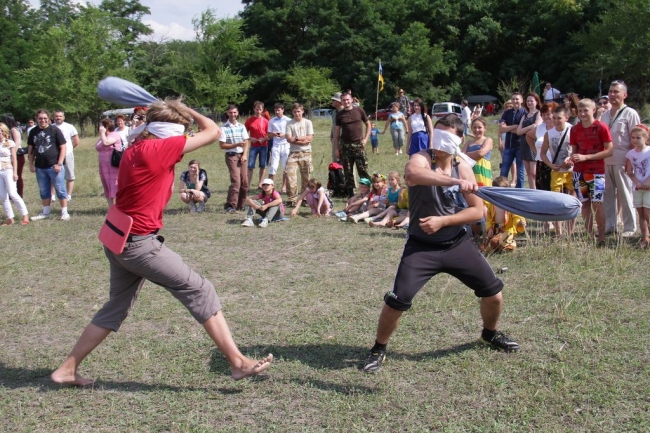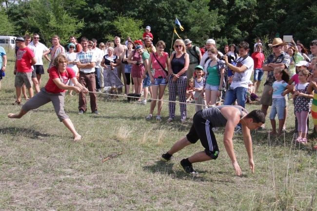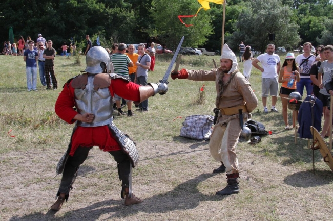 Гостей приглашали поучаствовать в игрищах – проверить свою силу и ловкость, стреляя из лука, метнуть копье, примерить на себя рыцарские доспехи. Также, особенно у ребятишек, популярностью пользовалось перетягивание каната, а мужчинам было интересно попробовать себя в «бою» мешками. Участникам завязывают глаза, а на одежду цепляют колокольчики. Задача – нанести противнику как можно большее количество ударов мешком, ориентируясь только на звук.