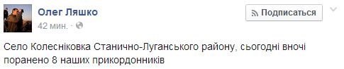 "Село Колесниковка Станично-Луганского района, сегодня ночью ранены 8 наших пограничников", - написал Олег Ляшко.