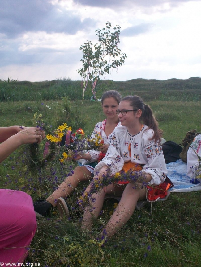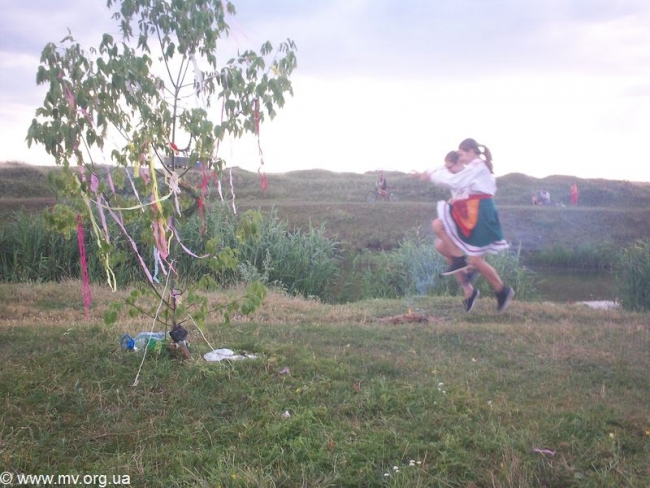 И "Полазники" отправились на берег Песчанского ручья, чтобы провести все действа. Они набрали полевых цветов, сплели венки, украсили ленточками и цветами деревце - "купайлицу". Песчанский непригоден для купания, поэтому кружковцы принесли с собой воду, чтобы облиться и таким образом пройти очищение водой. Но, как отмечает О. Човпило, пошел дождь и он стал источником очищения. Затем ребята разожгли костер, прыгали через него, очистившись огнем. А потом пришло время девушкам пускать венки со свечами на воду. У всех девчонок венки поплыли, не утонул ни один, свечи не погасли, что предвещает им счастливую долю. В купальском обряде участвовали Татьяна Соломяник, Александра Петрюк, Алина и Лилия Журавлева (ООШ-1), Елена и Оксана Киреевы (ООШ-11).
