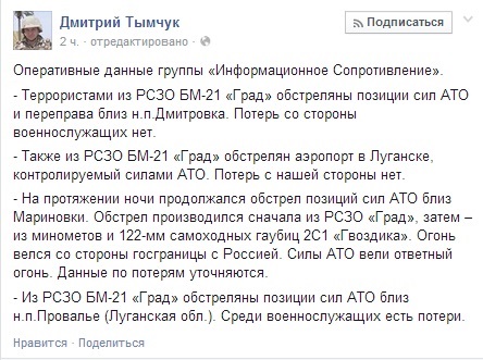 Сообщается, что "ополченцы" обстреляли ночью позиции и переправу сил АТО близ населенного пункта Дмитровка. По данным группы, за ночь также обстреляли Луганский аэропорт, контролируемый украинской армией. Потерь среди украинских военнослужащих нет.