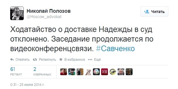 Воронежский областной суд Российской Федерации отклонил ходатайство о доставке украинской летчицы Надежды Савченко непосредственно на заседание суда. Об этом сообщил один из адвокатов украинки Николай Полозов на своей странице в Twitter пятницу, 25 июля.