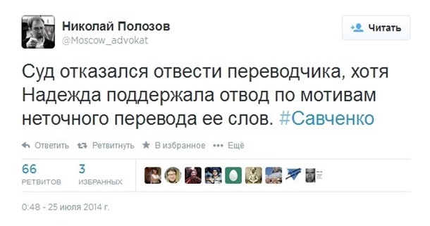 "Суд отказался отвести переводчика, хотя Надежда поддержала отвод по мотивам неточного перевода ее слов", - сообщил Полозов.