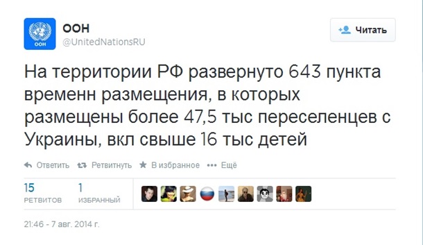 Согласно сообщению, среди этих беженцев находятся более 16 тысяч детей. "На территории РФ развернуто 643 пункта временного размещения, в которых размещены более 47,5 тыс. переселенцев с Украины, включая свыше 16 тыс. детей", - говорится в сообщении ООН.