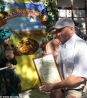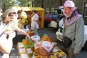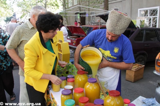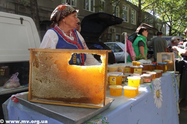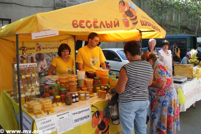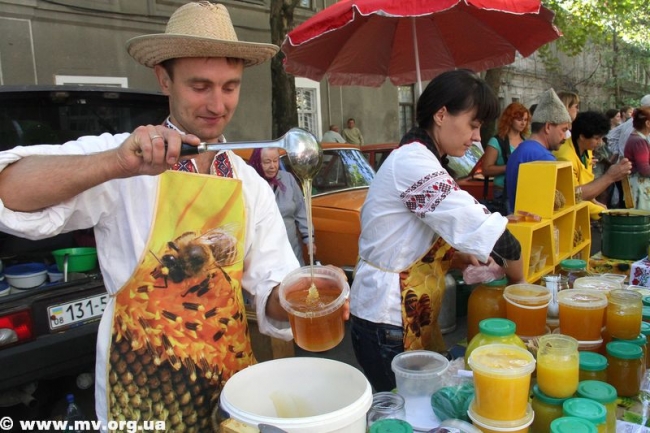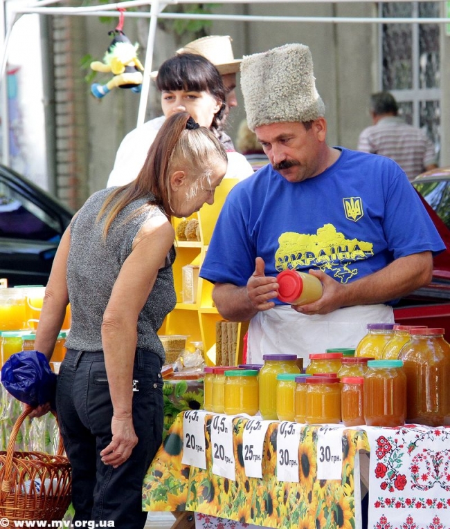 Скоморохи и Пасечник зазывали мелитопольцев и гостей города пройтись по "медовым" рядам, где пчеловоды и сельхозпроизводители, предприниматели и предприятия предлагали мед и продукты пчеловодства, овощи и фрукты, мясные и хлебобулочные изделия, сувенирную продукцию. Цены не зашкаливали: за кило яблок просили 4.50 - 8 грн., персиков и нектаринов - 15-20 грн., винограда - 7-12 грн., сливы 8-10 грн. 100 гр сотового меда стоил 10 грн., литр подсолнечного меда – 40 грн., цветочного – 50 грн., липового – 90 грн., гречишного – 70 грн. Манили отведать необычных питьевых медов пузатые бочонки и бутыли (стакан – 3 грн.), расположившиеся на прилавках. Здесь же широкий выбор "сопутствующих товаров" - пыльца, пчелиный подмор, прополис, свечи из натурального пчелиного воска, медовое мыло и многое другое.