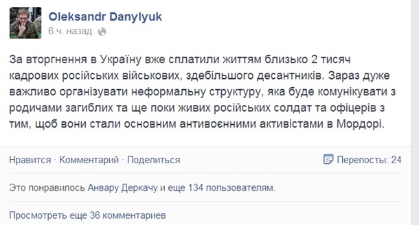 "Сейчас очень важно организовать неформальную структуру, которая будет коммуницировать с родственниками погибших и еще пока живых российских солдат и офицеров", - добавил Данилюк.