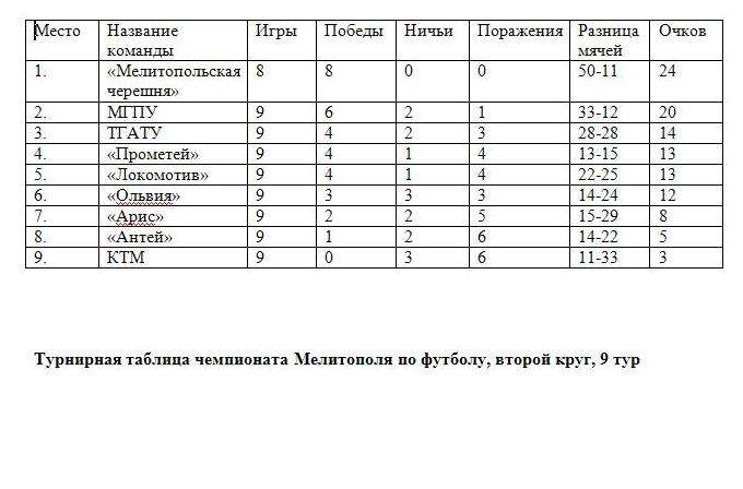Ниже смотрите турнирную таблицу после 9 тура чемпионата Мелитополя по футболу.