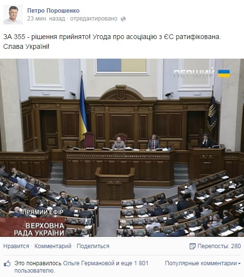 Глава государства поставил свою подпись под документом прямо в сессионном зале, сразу продемонстрировав документ со своей подписью присутствующим в зале народным депутатам. В свою очередь парламентарии встретили действия Порошенко аплодисментами и одобрительными выкриками.