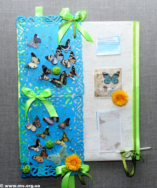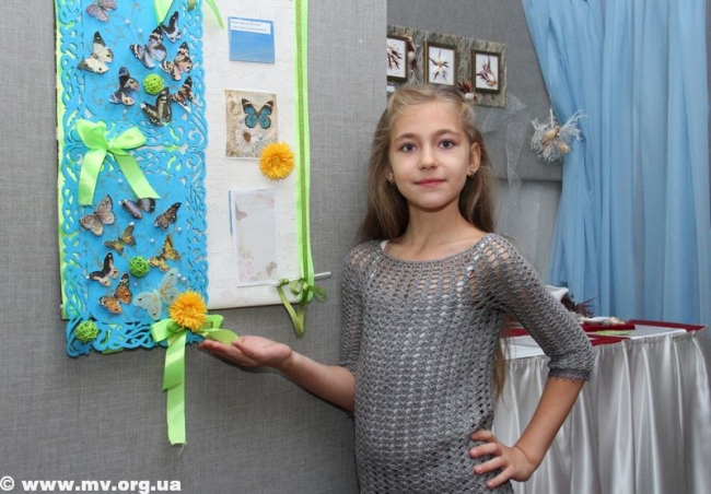А девятилетняя Полина Карпенская занимается в "Вилории" уже три года. Для выставки она создала очень оригинальный коллаж-напоминание. Говорит, что труднее всего было вырезать бабочек для коллажа, чем затем компоновать из них композицию. А вообще девочка любит рисовать пальцами на холсте тремя красками: желтой, синей и красной. Получается очень фантасмагорическое, красивое изображение.
