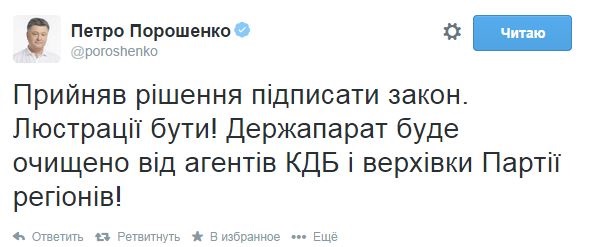 "Принял решение подписать закон. Люстрации быть! Госаппарат будет очищено от агентов КГБ и верхушки Партии регионов! ", - говорится в сообщении.