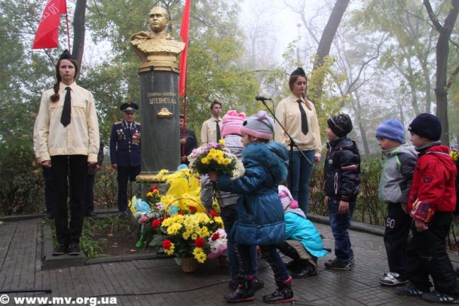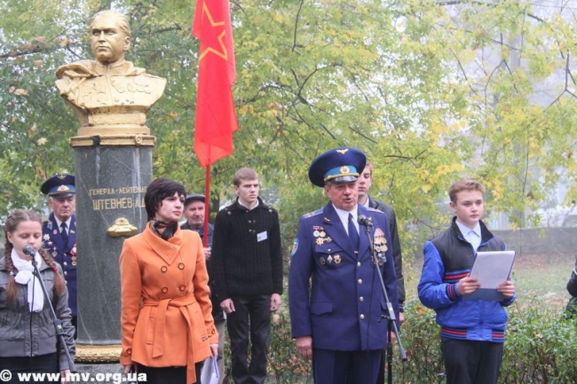 В парке железнодорожников возле памятника Герою Советского Союза генерал-лейтенанту Андрею Штевневу собрались ветераны и участники Великой Отечественной войны, заместитель городской организации ветеранов Евгений Бабенко, председатель совета ветеранов железнодорожного узла Александра Пашко, председатель организации ветеранов управления образования Олег Есипенко, представители городской власти и управления образования, школьники и педагоги.