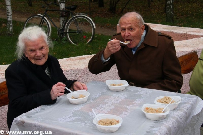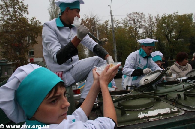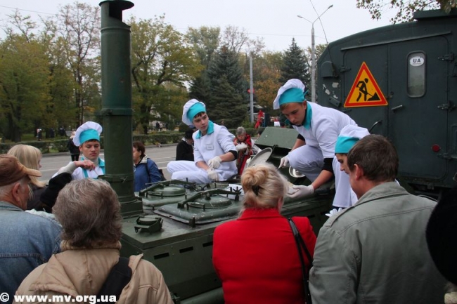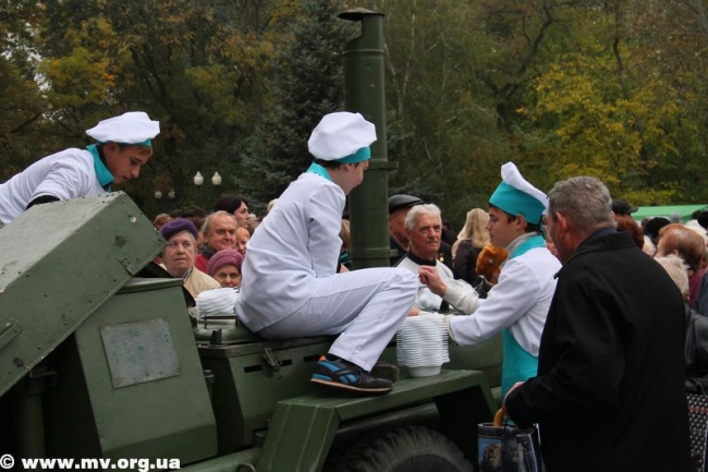 Перед входом в парк культуры и отдыха им. М. Горького для всех желающих развернули свою работу полевые кухни. Отведать солдатской каши выстроились целые очереди мелитопольцев и гостей. Обслуживать горожан помогали проворные и вежливые поварята - учащиеся Мелитопольского торгово-профессионального лицея. Для ветеранов организовали столики и стулья, чтобы они могли не спеша посидеть, поесть солдатскую кашу, пообщаться. А потом их пригласили в специально украшенный автобус ДЮСШ-3, чтобы доставить в ДК им. Т. Шевченко на праздничный концерт "Эх, путь-дорожка полевая!".