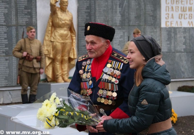 На сельском мемориале собрались ветераны Великой Отечественной войны, взрослые мордвиновцы и школьники, представители районной и городской власти, районных ветеранских организаций. Конечно же, главными и почетными гостями на празднике стали именно ветераны, среди которых выделялся бравый ветеран в черкеске с кортиком, грудь которого увешана множеством наград. Это ветеран Великой Отечественной войны, участник прорыва линии обороны "Вотан" 90-летний житель Одесской области Михаил Шуляк. По словам Михаила Спиридоновича, в начале войны он был призван в ряды Красной Армии на Кубани. С боями прошел Украину, Беларусь, Молдову, Польшу, Венгрию, Румынию. "В Чехословакии, когда мне было 20 лет и три месяца я встретил весть о великой Победе!" - вспоминает ветеран. После войны он продолжил службу в рядах советской армии. Проживает в Одесской области. За заслуги ему были присвоены звания почетного гражданина городов Овидиополь, Раздельное, Беляевки. Несмотря на солидный возраст, Михаил Спиридонович ведет активный образ жизни, участвует во многих общественных мероприятиях. "Я рад, что я приехал отпраздновать с вами эту дату - 71-ю годовщину освобождения. Так уж получилось, что на праздник я приехал впервые, хотелось и раньше, но так уж сложилась жизнь. Но обещаю, что обязательно приеду и в следующем году", - под аплодисменты собравшихся пообещал ветеран.