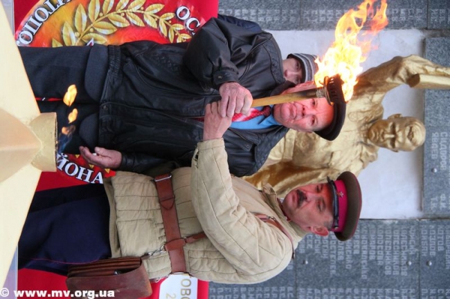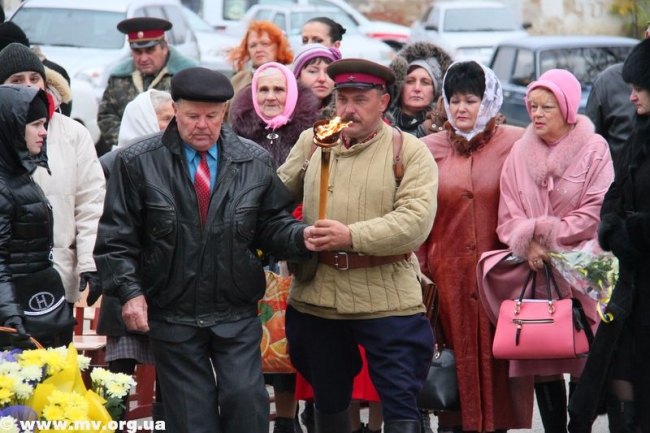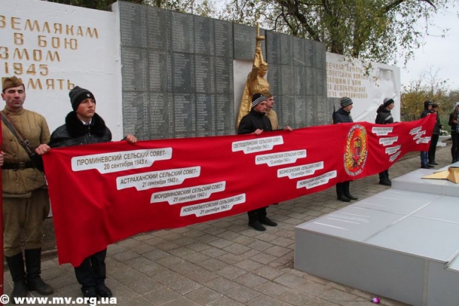 Митинг проходил под флагами Украины, Мелитопольского района и знаменем Победы. Мордвиновские школьники вынесли ленту памяти, на которой были даты освобождения 15 сельских советов Мелитопольщины. Первым был освобожден 20 сентября 1943 г. Проминевский сельсовет, последним - 28 октября 43-го Новгородковский сельсовет. Право зажечь Огонь освобождения было предоставлено ветерану войны, участнику боевых действий Ивану Гуляко и руководителю Мелитопольского историко-патриотического клуба "Противостояние" Евгению Горлачову.