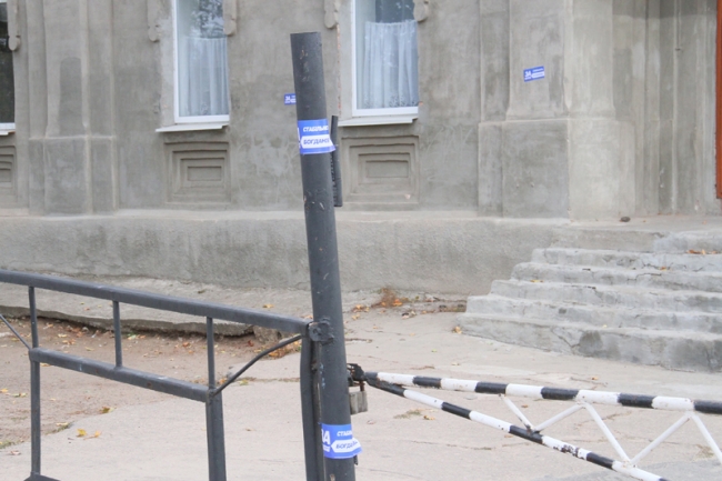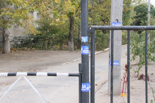 На фасаде ближнего к улице школьных зданий и ворот людей встречают агитки партии "Оппозиционный блок" с фамилией кандидата по округу Игоря Богданова. Политрекламы других партий и кандидатов на участке не замечено.