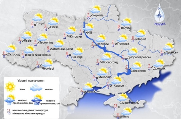 Температура ночью в Украине составит -2…7°С, в восточных областях – 6…11°С мороза, днем ожидается +4…9°С; на Закарпатье и Крыму ночью прогнозируется от +3°С до -3°С, днем воздух прогреется до 8…13°С тепла.
