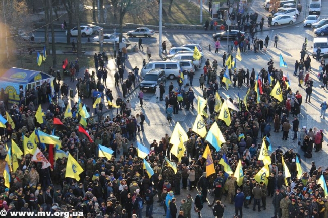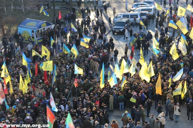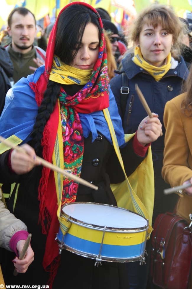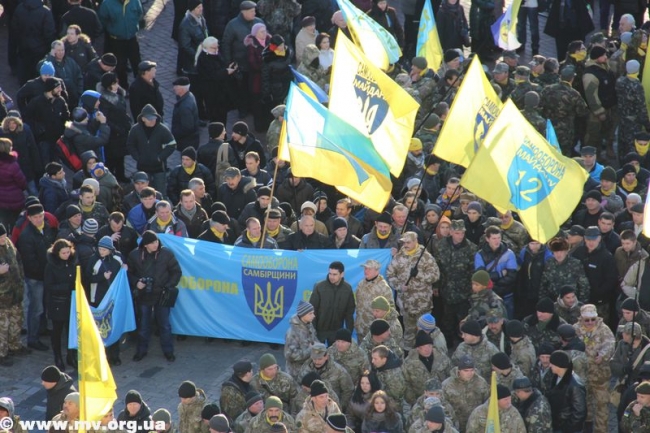 Когда мы пришли на Михайловскую площадь, там уже было людно. Вокруг развевались флаги самообороны, государственные флаги и стяги УПА. Собравшиеся приветствовали своих побратимов, с которыми плечом к плечу стояли на баррикадах.