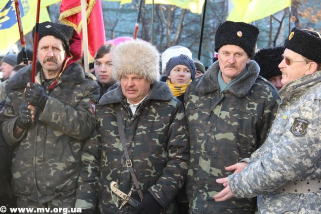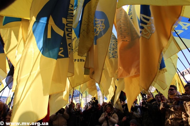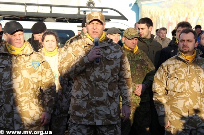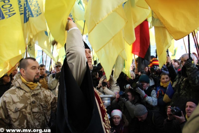 После речей А. Парубия и других активистов Майдана, архимандрит Лаврентий освятил флаги самообороновцев, некоторые из которых в ближайшее время отправят в АТО.