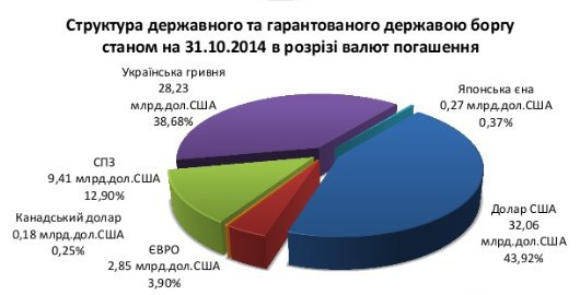 По состоянию на 31 октября 2014 года государственный и гарантированный государством долг Украины состоял из кредитов в гривне, долларах, евро, специальных правах заимствования и японских иенах. Их общий размер составлял 72,99 миллиарда долларов, или 945,3 миллиарда гривен по тогдашнему курсу 12,95 грн/долл. Из этой суммы 28,23 миллиарда долларов, или примерно 365,6 миллиарда гривен были номинированы в национальной валюте.