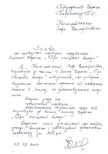 "Я, Коломойский Игорь Валериевич, согласно статье 4 закона Украины "Об очищении власти" сообщаю, что запреты, определенные частью третьей или четвертой статьи 1 закона, не применяются в отношении меня. Даю согласие на прохождение проверки, обнародование ведомостей о себе согласно требованиям закона Украины "Об очищении власти", - говорится в документе.