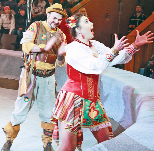 В абсолютный восторг взрослых и детей привело и следующее выступление. На арену выехала целая процессия - деревянная повозка, запряженная козой - символом будущего года. А на повозке восседала настоящая украинская красавица - аппетитная, чернобровая и кокетливая Украиночка. Она наповал сразила проходящего мимо Охотника. Он решил во что бы то ни стало завоевать расположение Украиночки.