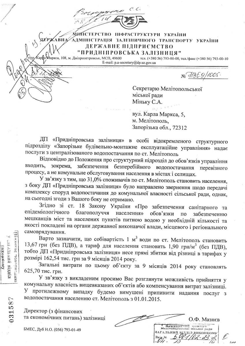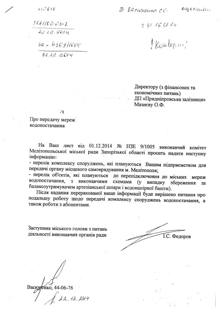 Стоит отметить, что в письме, пришедшем на имя секретаря Мелитопольского горсовета, значится информация о том, что со стороны ГП «Придніпровська залізниця» было направлено обращение о передаче комплекса сооружений водоснабжения в коммунальную собственность сельсовета (!), но перечня этих сооружений предоставлено не было. Естественно, что предприятию было направленно соответствующее письмо с просьбой дополнительных разъяснений (см. фото).