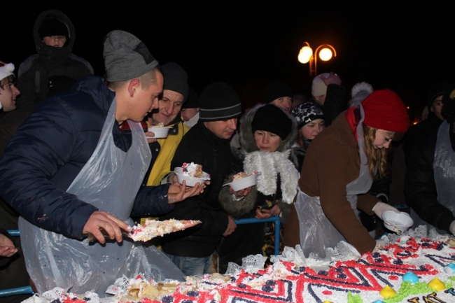Вот уже третий год местная власть готовит угощение для своих горожан, в позапрошлом году была целая ладья салата Оливье, а два последних года для мелитопольцев выпекается громадных размеров торт, чтобы всем хватило. В этом году сладкое лакомство было выполнено в национальных тонах, с украинским орнаментом. Однако, как оказалось, идти на рекорд и выпекать поистине гигантских размеров торт было вовсе не обязательно, желающих отведать праздничного десерта вышло не так уж много, и анонсируемые 2015 кусочков торта, вряд ли уместились бы в 2-х, ну, максимум 3-х сотнях животов собравшихся на площади людей. Хотя, это вовсе не помешало нашим горожанам устроить толкотню около входа в ДК им. Шевченко, где и раздавали новогоднее угощение.