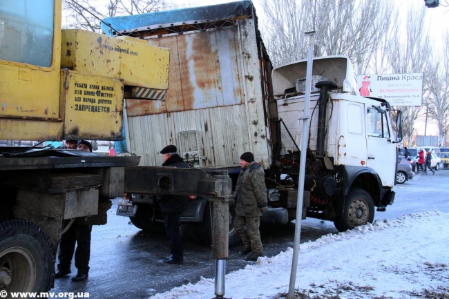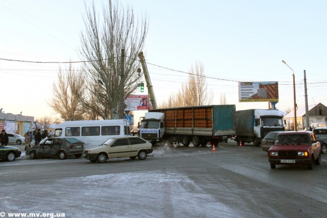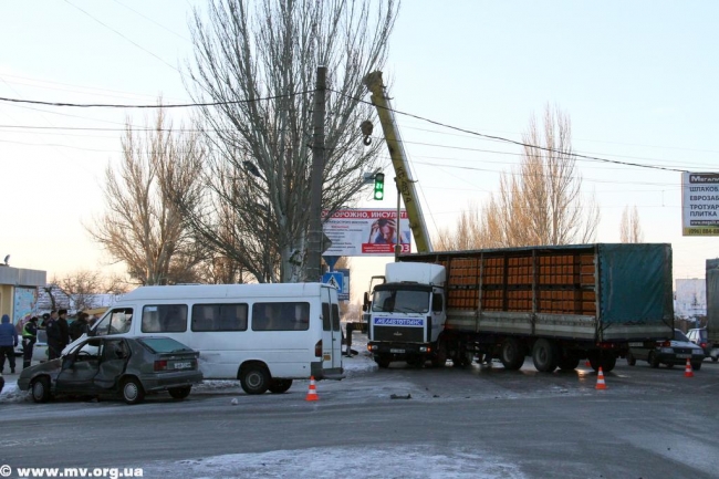 Как рассказал начальник Мелитопольской госавтоинспекции Федор Парапанов, водитель большегруза двигался в южном направлении. К перекрестку он подъехал, по словам водителя, когда до переключения зеленого сигнала светофора оставалось 7 секунд (светофор на этом перекрестке имеет "счетчик" времени). Машина начала тормозить, однако на скользкой дороге не смогла выполнить этот маневр и начала "складываться". После чего въехала в "Рено", а уж тот автомобиль, в свою очередь, врезался в маршрутку.