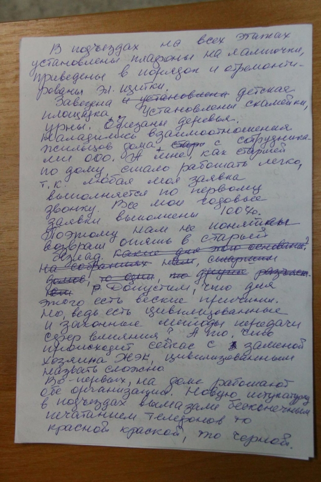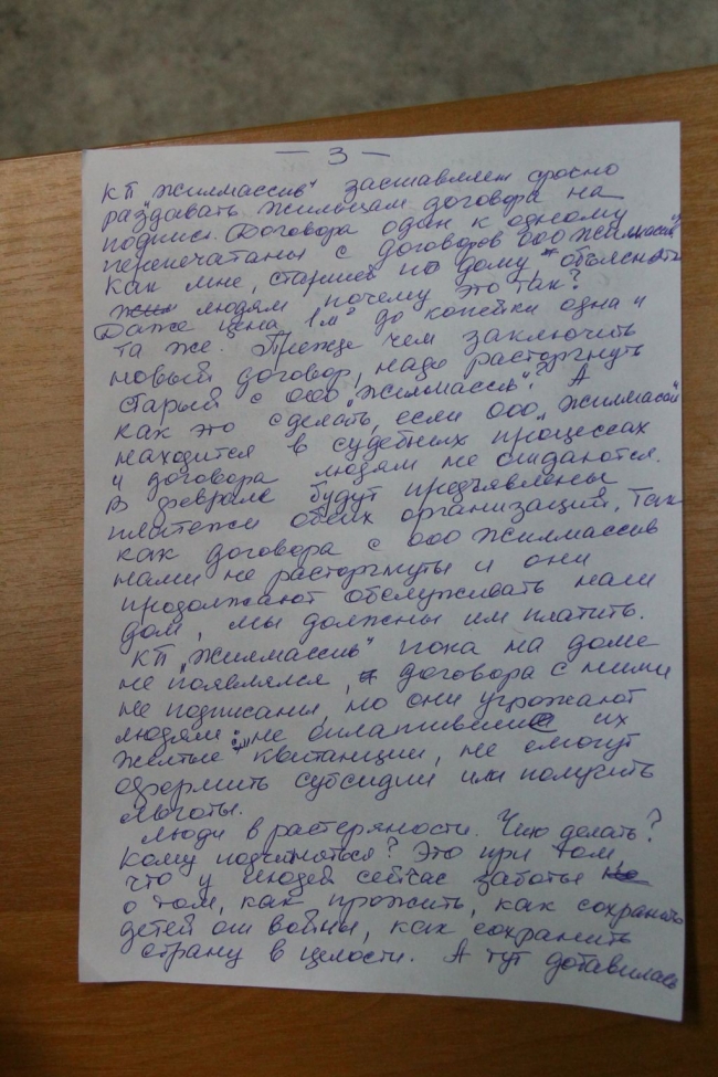 Наладились и отношения между жильцами дома и сотрудниками ООО «Жилмассив». А мне, как старшей по дому, стало работать легко - любая моя заявка выполняется по первому звонку. Все мои годовые заявки выполнены на 100 проц. Поэтому нам не понятен возврат к старому устрою. Допустим, что для этого есть веские причины. Но, ведь есть цивилизованные и законные методы передачи сфер влияния. А то, что происходит сейчас с заменой обслуживающего предприятия, цивилизованным назвать сложно. Во-первых, дом обслуживают обе организации, новую штукатурку в подъезде вымазали бесконечным печатанием телефонов то красной краской, то черной. КП «Жилмассив» заставляет срочно раздавать жильцам договоры на подпись. Оба договора (с ООО и с КП) идентичны. Как мне, старшей по дому, объяснять людям, почему это так? Даже тариф один. В феврале будут предъявлены платежи обоих организаций. Так как договоры с ООО «Жилмассив» нами не расторгнуты, они продолжают обслуживать наш дом, мы должны им платить. КП «Жилмассив» пока не проводил какие-либо собрания с жильцами нашего дома, договор с ними не подписан, но они уже угрожают тем, что жители, не оплатившие их квитанции, не смогут оформить субсидию или получить льготы.