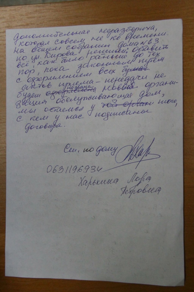 Люди в растерянности. Что делать? Кому подчиняться? Это при том, что у людей сейчас заботы о том, как прожить, как уберечь детей от войны, как сохранить страну в целости. А тут добавилась дополнительная проблема. Которая совсем не ко времени. На общем собрании нашего дома мы с жильцами решили: оставить все как было раньше до тех пор, пока законным путем с оформлением всех актов приема-передачи и не будет названа новая организация, обслуживающая дом, мы остаемся у того, с кем у нас подписаны договоры.