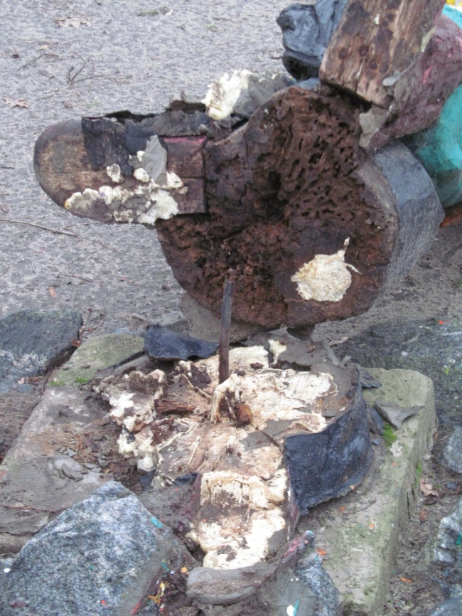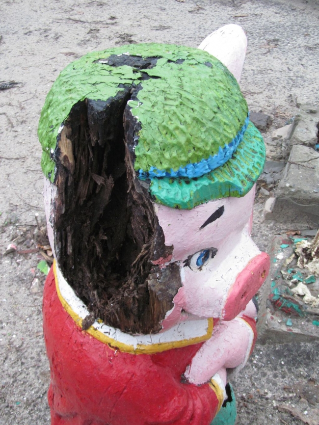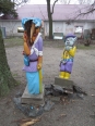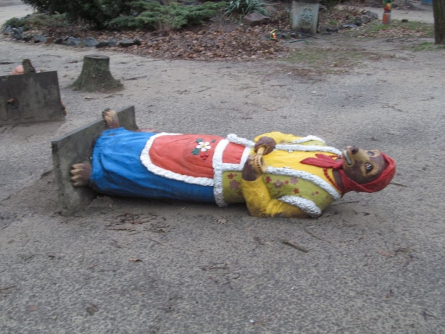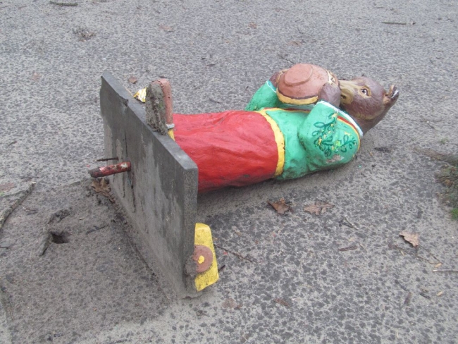 Сегодня рано утром деревянные фигуры сказочных персонажей, стоящие на «Поляне сказок» привлекли внимание вандалов. Хулиганы не ограничились лишь тем, что вырвали почти половину всех фигур с их бетонных оснований, некоторые сказочные зверушки поломаны, и не факт, что подлежат восстановлению.