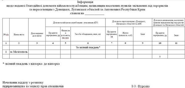 В форме, которую волонтерам предлагают заполнять еженедельно, в частности, просят отдельно указывать, сколько помощи продуктами, деньгами и оборудованием было передано военнослужащим, а сколько - продуктами, жильем и пр. - вынужденным переселенцам или людям, которые находятся на временно оккупированных территориях.