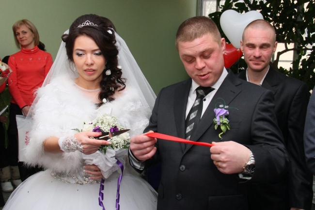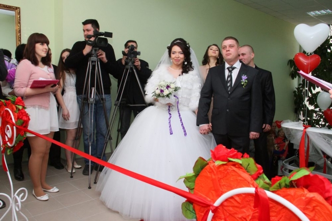 И вот в 10.00 красная ленточка перед дверьми в зал бракосочетаний была перерезана. Это право досталось первой обвенчавшейся в нем паре – Вадиму и Марии Данченко.