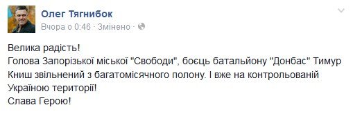 Среди освобожденных и запорожский боец батальона "Донбасс", свободовец Тимур Кныш. Об этом в Фейсбуке сообщает глава ВО "Свобода" Олег Тягнибок.