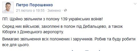 21 февраля с плена освободили 139 украинских военных. Среди них те, кто был захвачен в плен под Дебальцево, а также "киборги", защищавшие Донецкий аэропорт. Об этом сообщил Петр Порошенко на своей страничке в Фейсбуке.